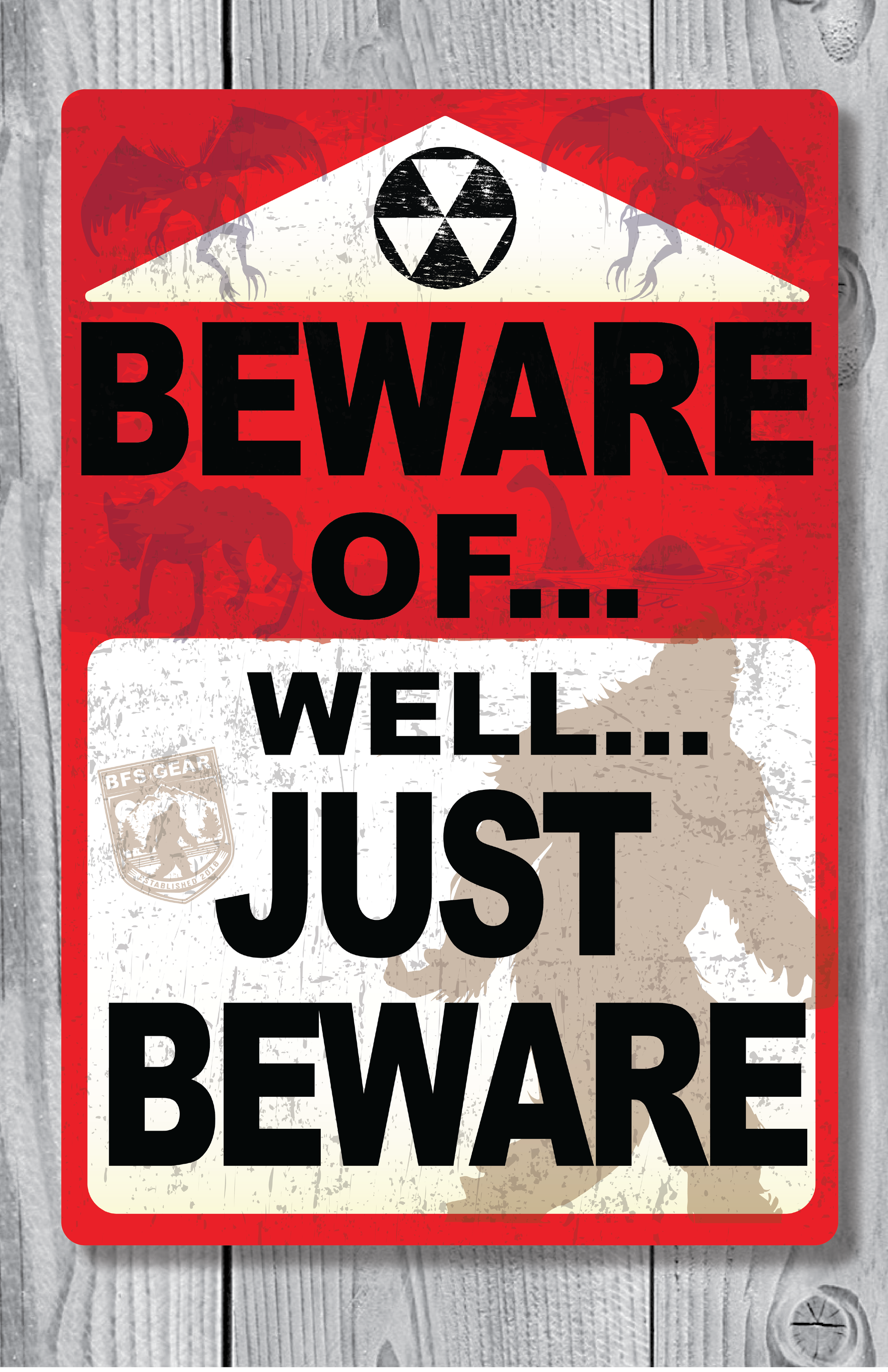 No time to explain, just beware. This sublimated aluminum sign measures 12x18 and is perfect for indoor or outdoor use to warn everyone of the mysterious dangers lurking in the woods.